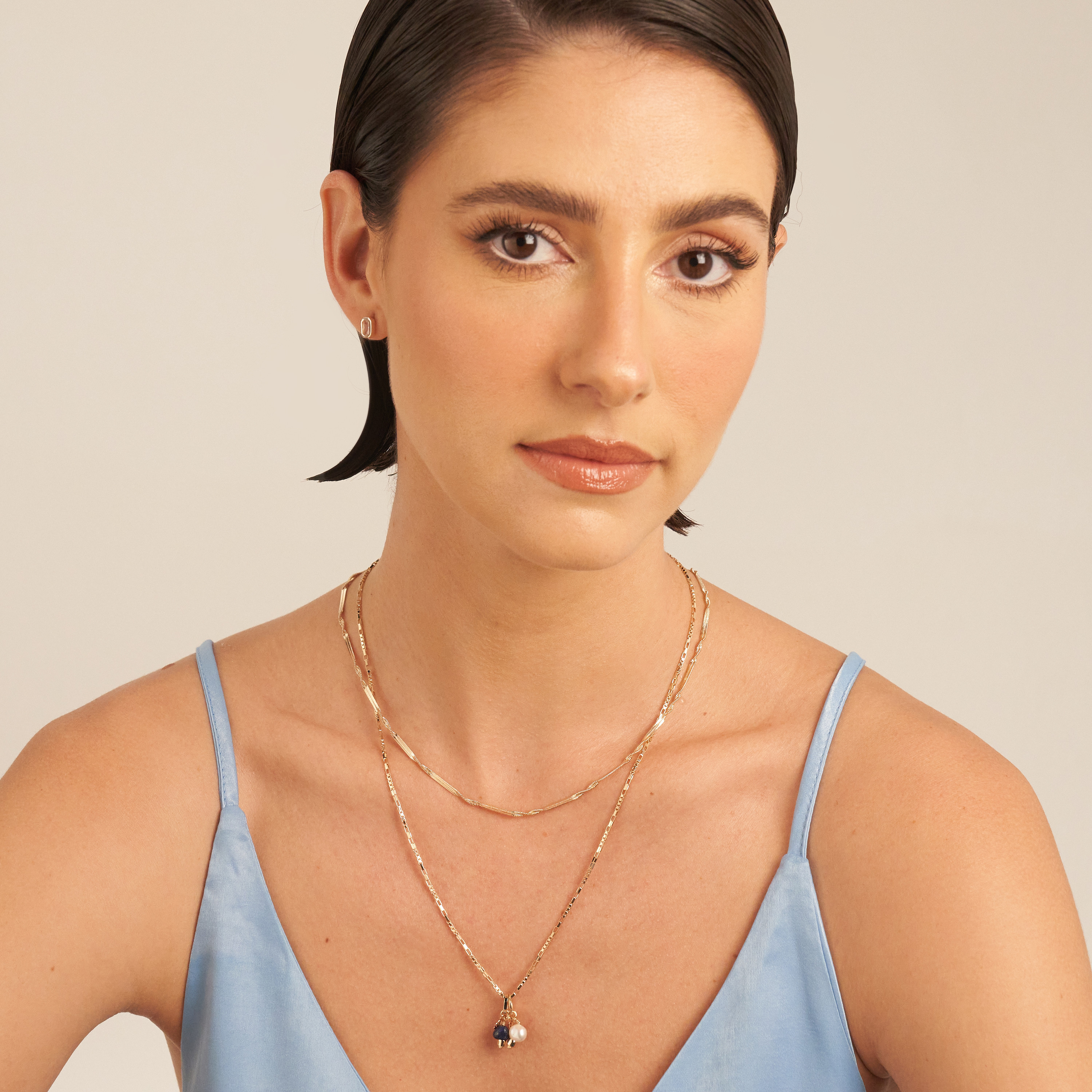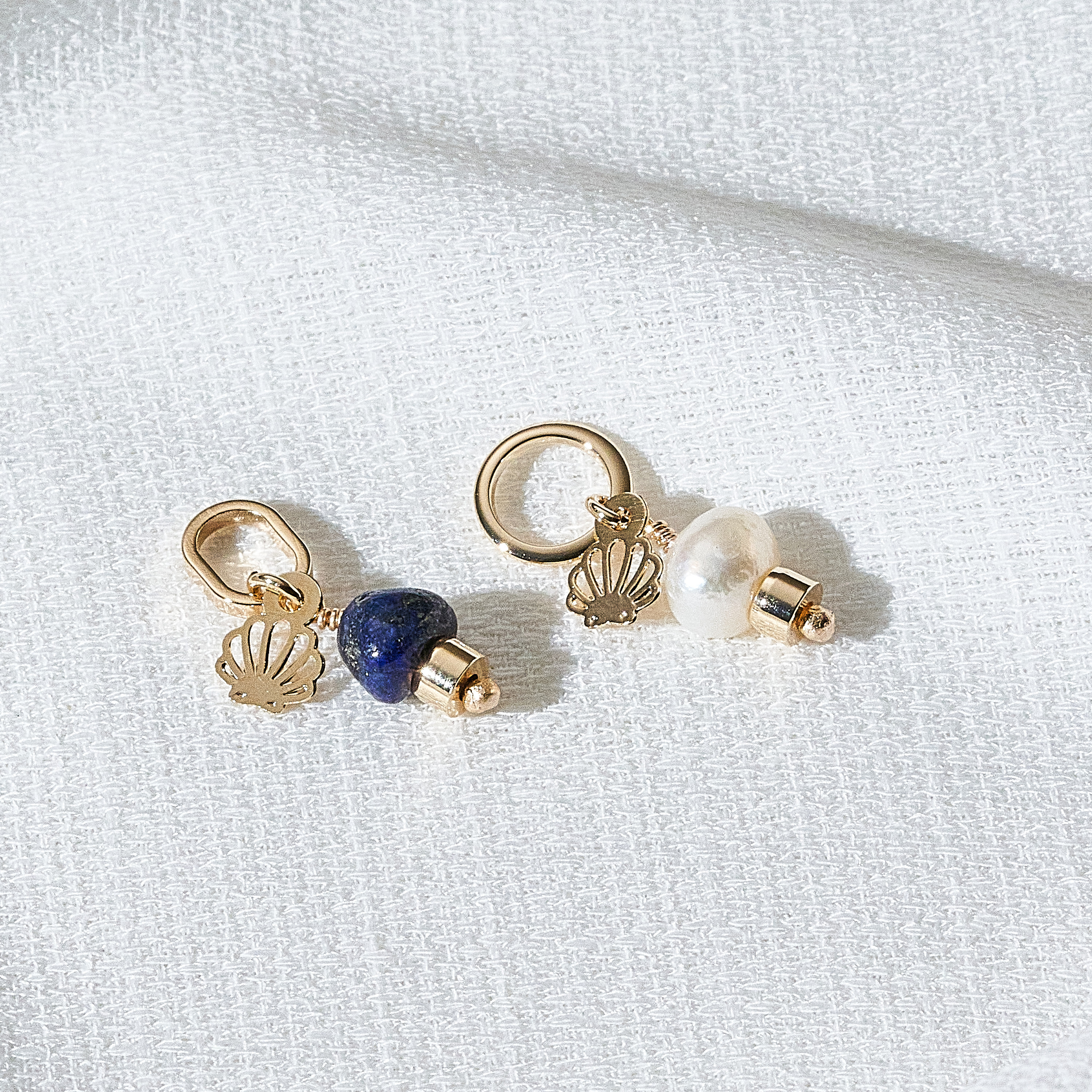 Essa dupla de pingentes pode ser usada em colares ou pulseiras. Um pingente é composto por uma argola redonda, a concha da Una e uma pérola barroca pão, natural de água doce; e o outro por uma argola alongada, a concha da Una e uma pedra lápis lazúli natural. As peças foram banhadas em ouro 18k, receberam camada de verniz antialérgico e não possuem níquel na composição. Pode haver variações nas cores e formatos da pérola e da pedra.