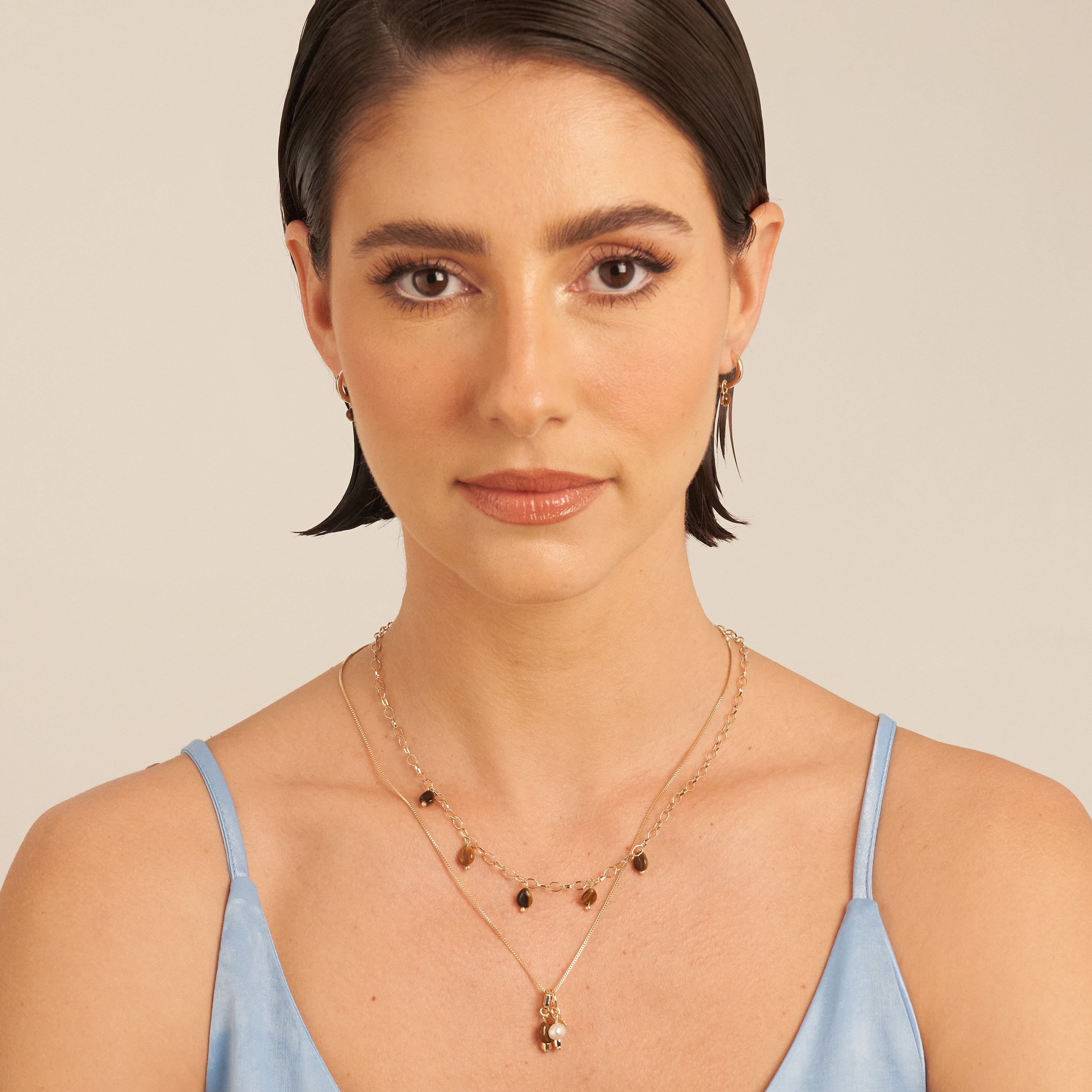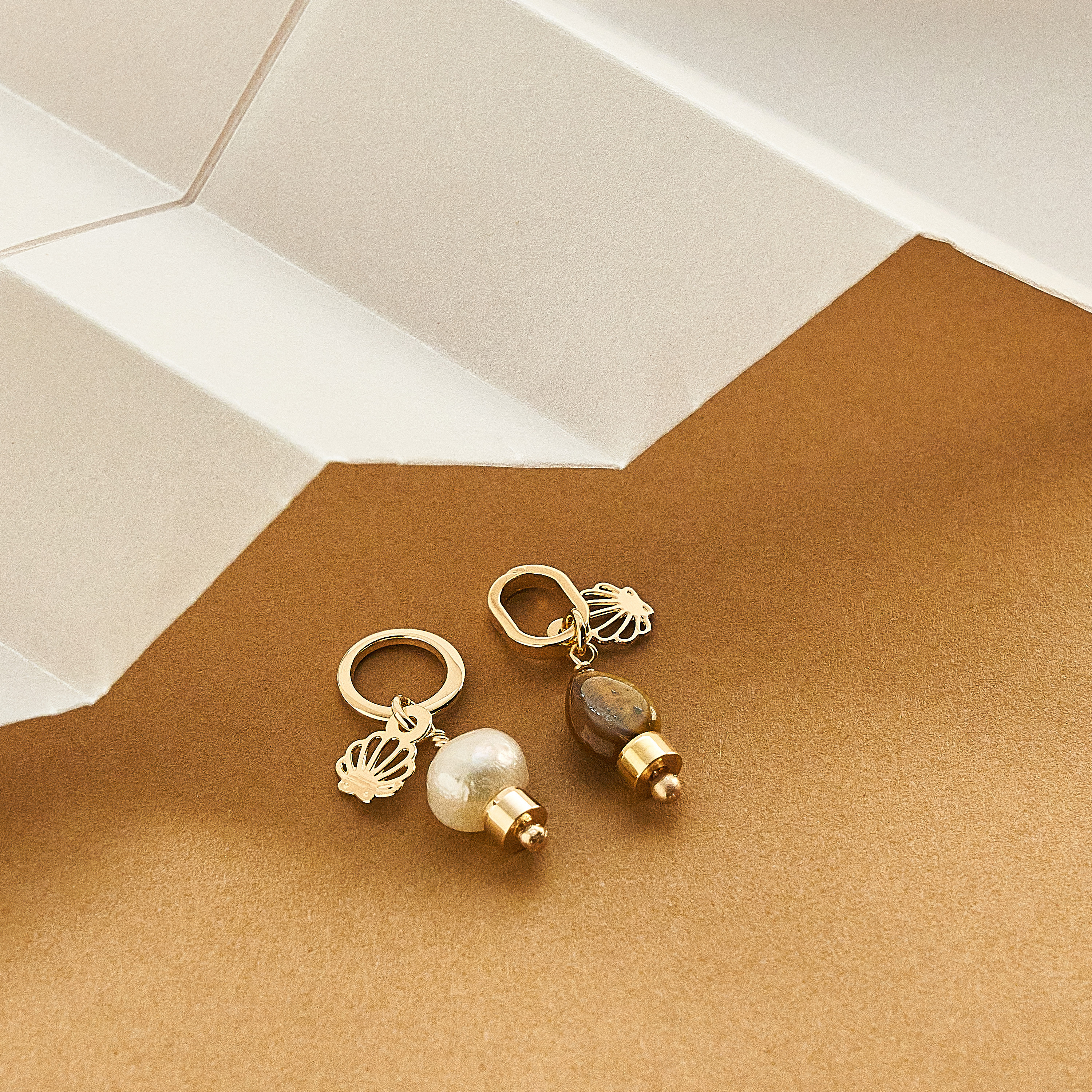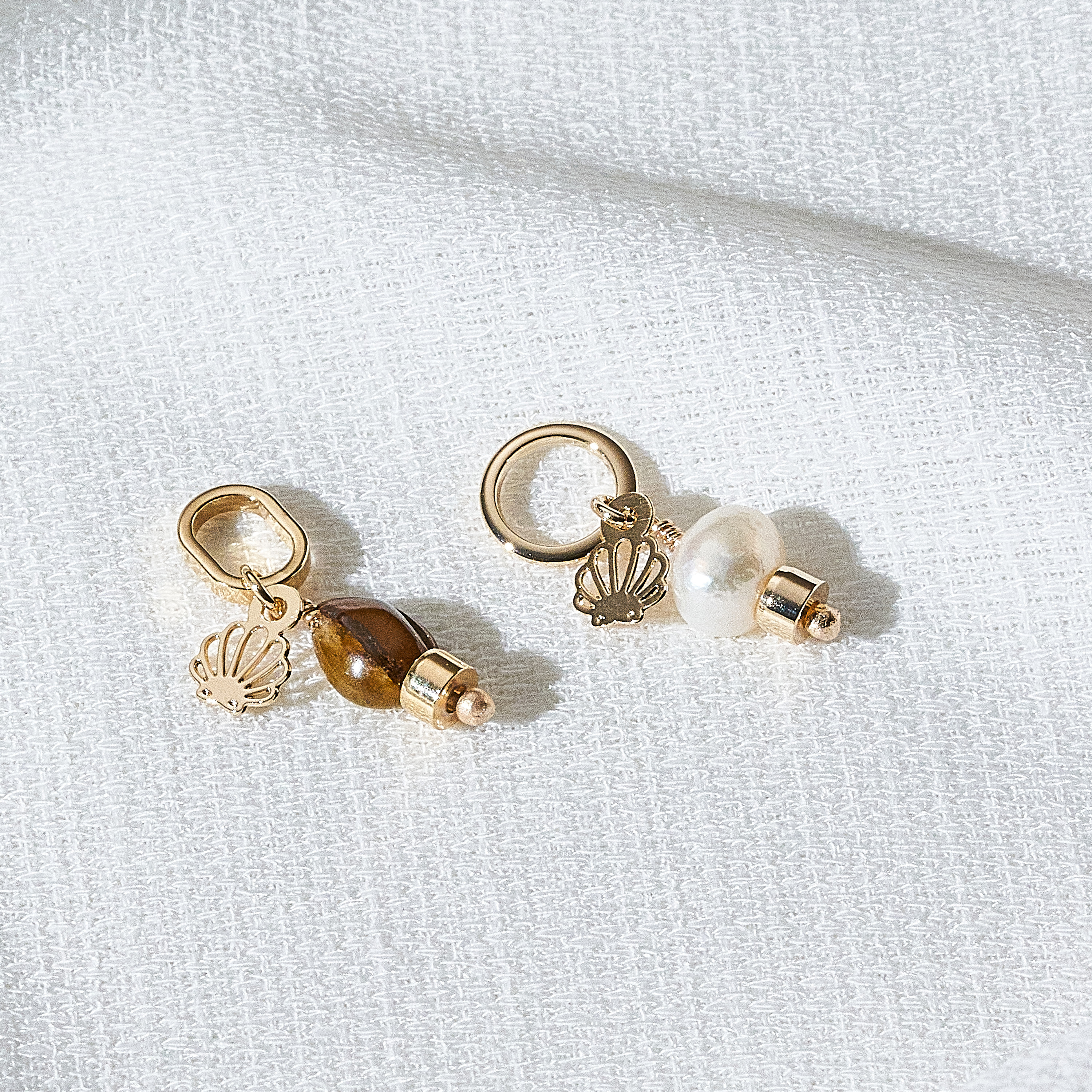 Essa dupla de pingentes pode ser usada em colares ou pulseiras. Um pingente é composto por uma argola redonda, a concha da Una e uma pérola barroca pão, natural de água doce; e o outro por uma argola alongada, a concha da Una e uma pedra olho de tigre natural. As peças foram banhadas em ouro 18k, receberam camada de verniz antialérgico e não possuem níquel na composição. Pode haver variações nas cores e formatos da pérola e da pedra.