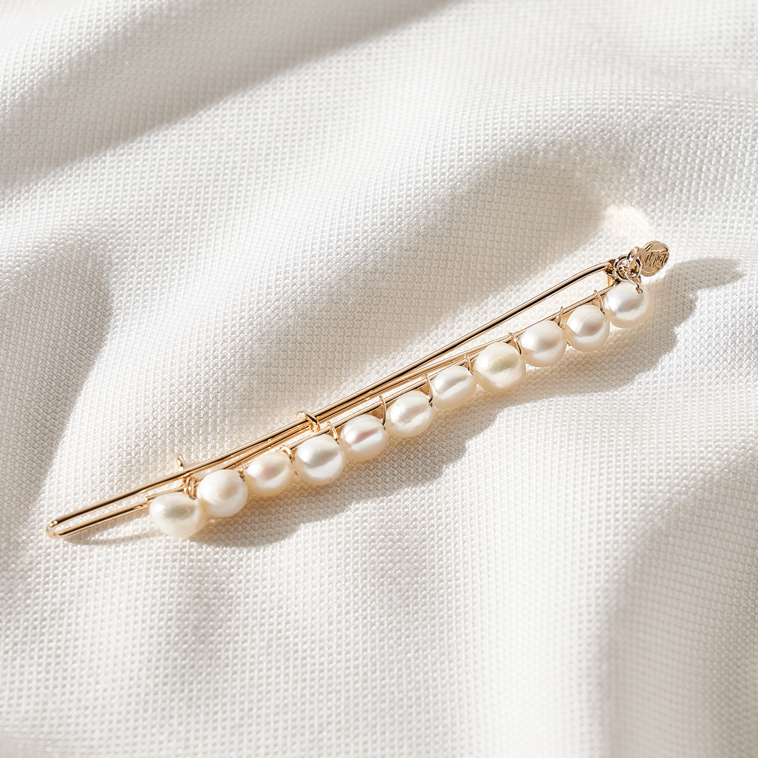 A presilha Leonna é um modelo com fecho clique. O acessório possui onze pérolas pão, naturais de água doce, em sua parte superior, e uma placa em formato elíptico com a inscrição do logo da Una e do Ps 139:14. Peça banhada em ouro 18k, recebeu camada de verniz antialérgico e não possui níquel na composição. Pode haver variações no formato e cor das pérolas.