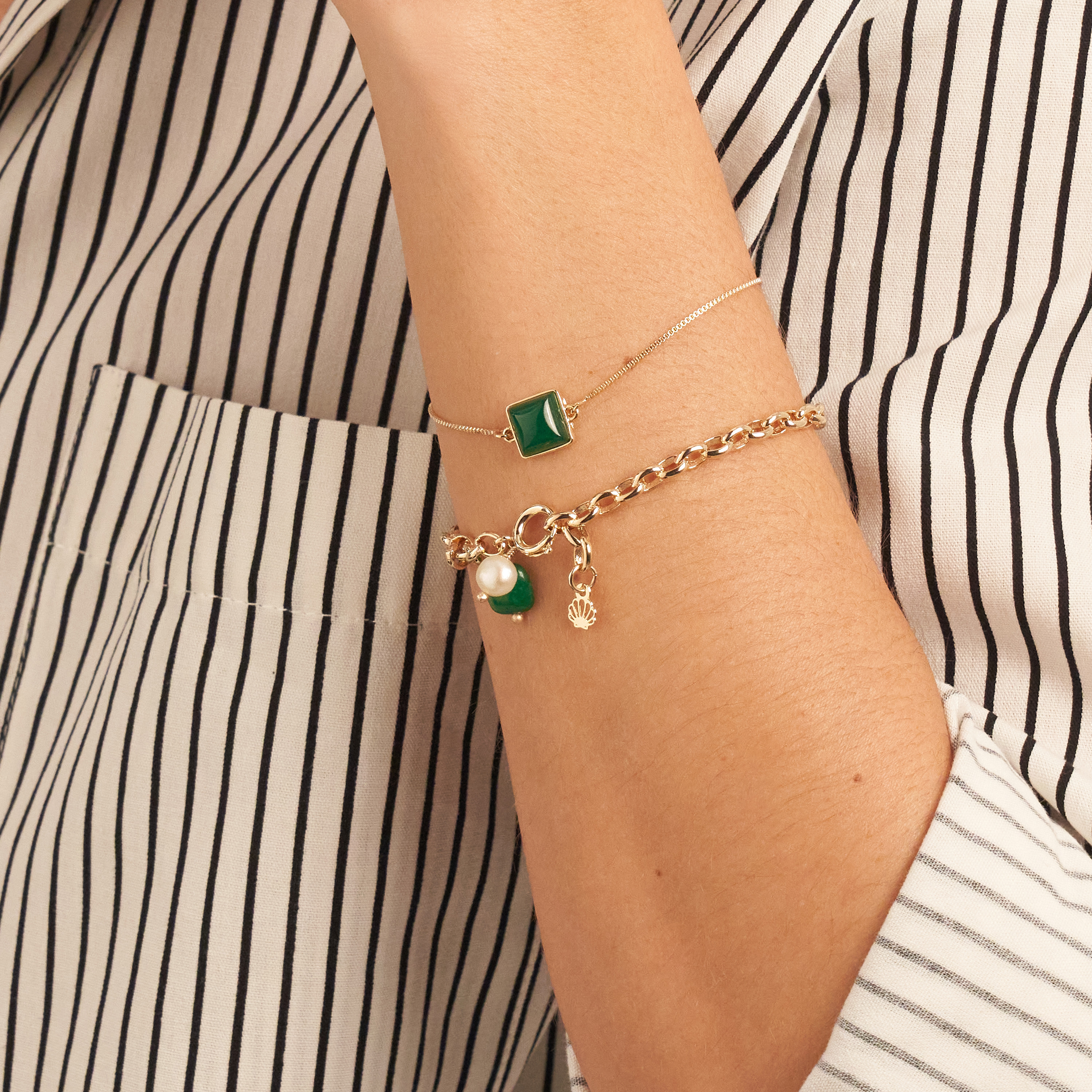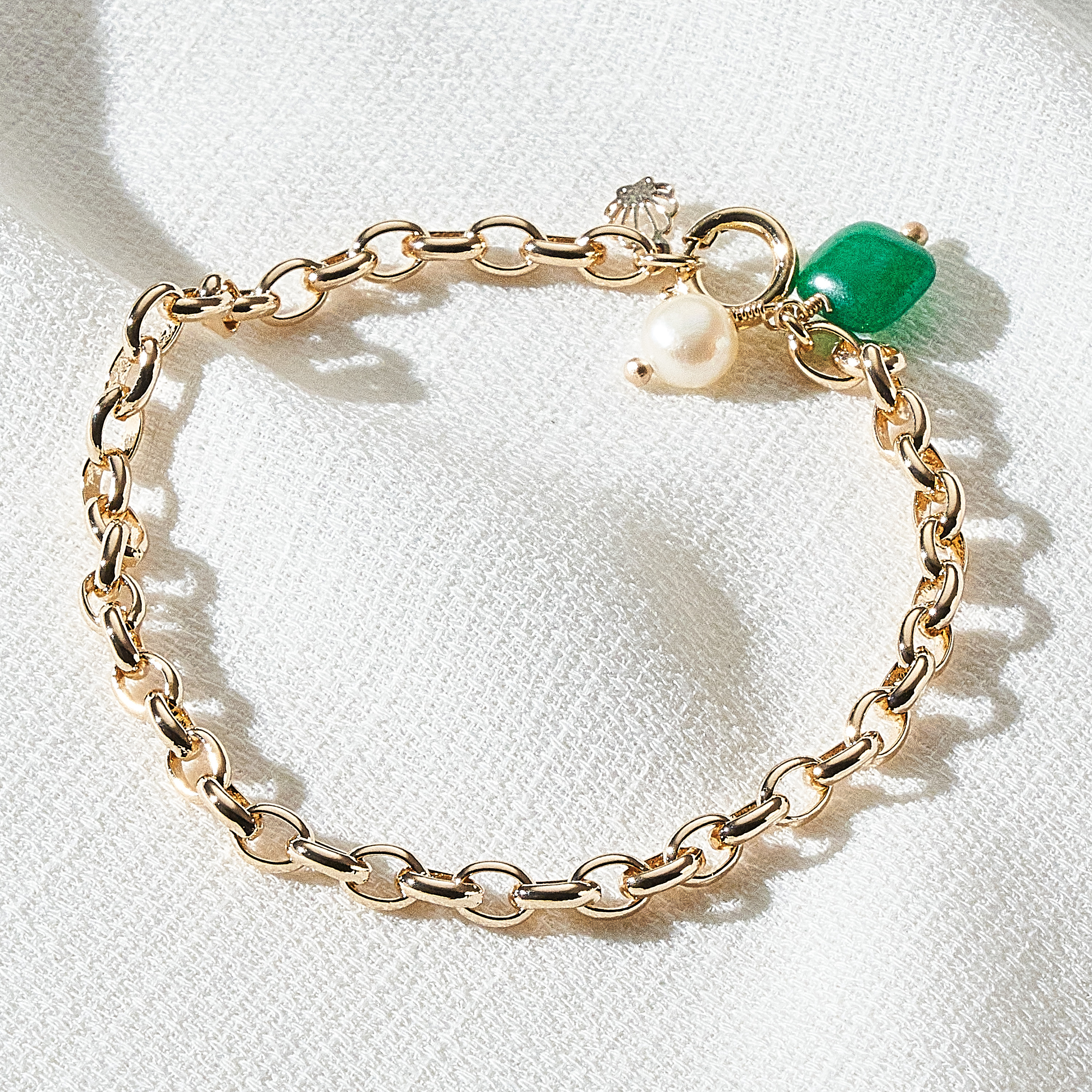 A pulseira Dóris esbanja elegância, faz a junção da corrente cadeado com os pingentes de pérola natural de água doce e a padra jade malasia. Uma peça ideal para qualquer ocasião. Possui a nossa concha Una e fecho boia. Peça banhada em ouro 18k, com verniz antialérgico e níquel free. Pode ter variações no formato e cor da pérola.
