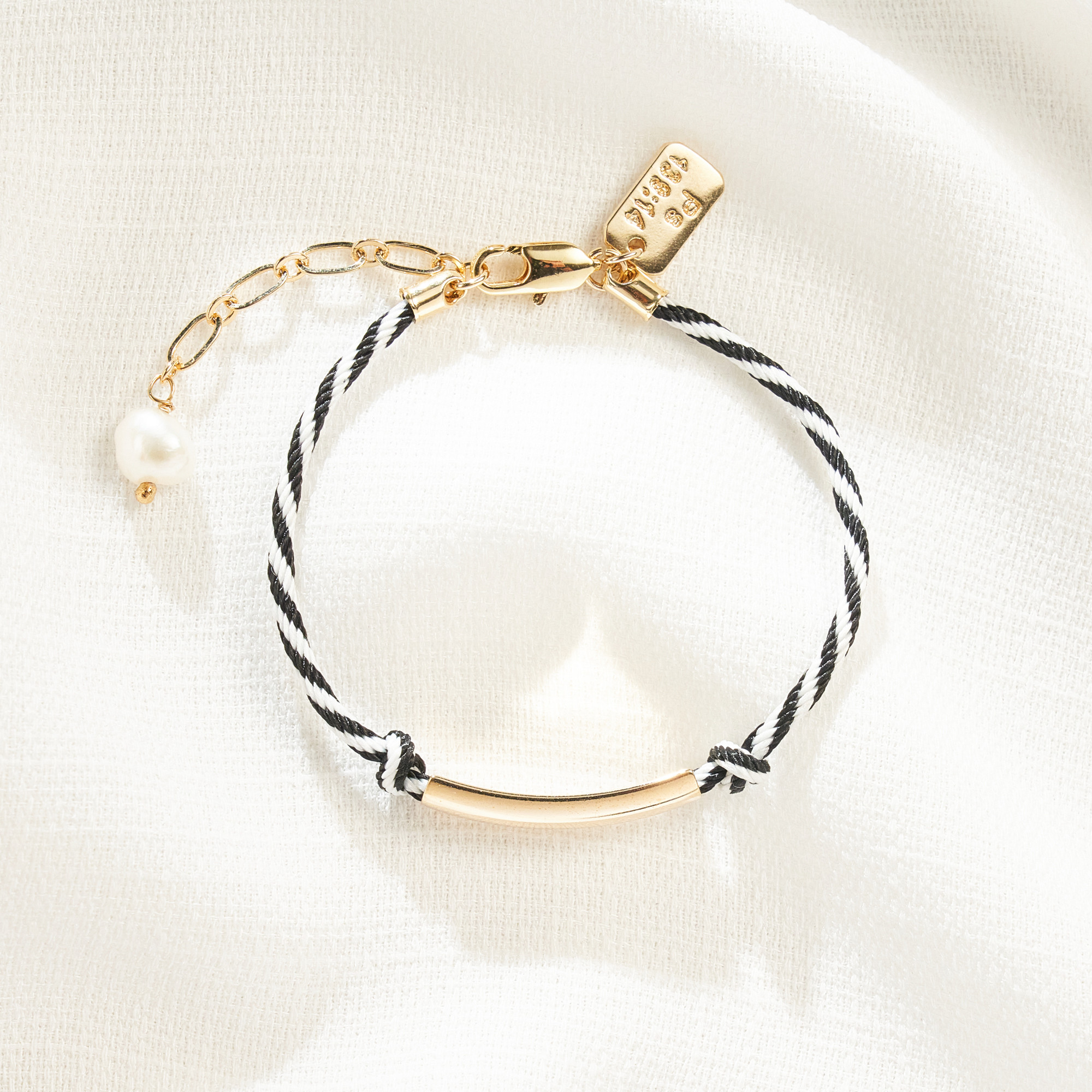 Pulseira Georgia básica com cordão preto e branco torcido e pingente central de tubo meia lua. Extensor de corrente de elos com detalhe de pérola barroca pão. Fecho italiano e mini placa retangular Ps(139:14). Banhado em ouro 18k, com verniz antialérgico e níquel free. Pode ter variação no formato e tamanho da pérola.