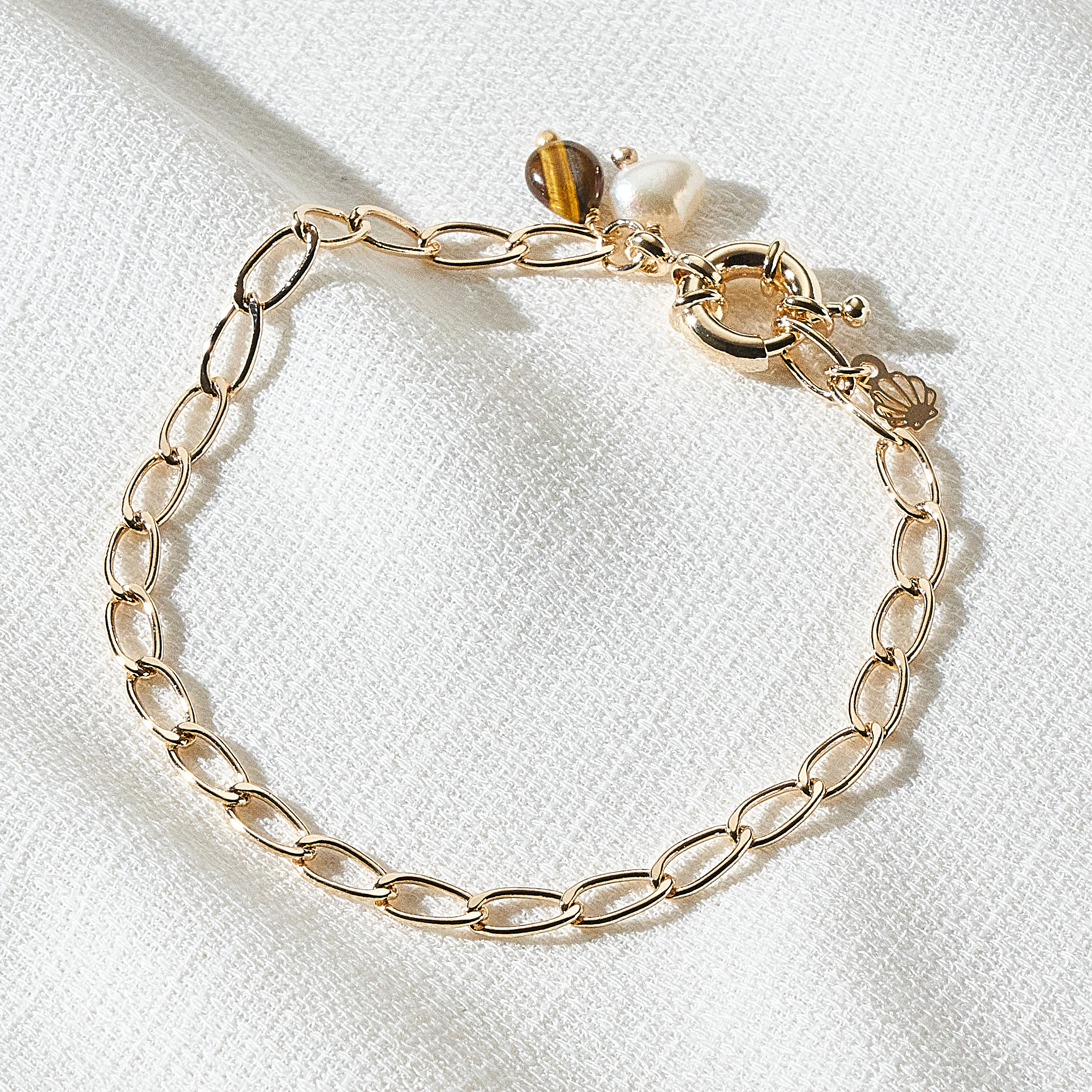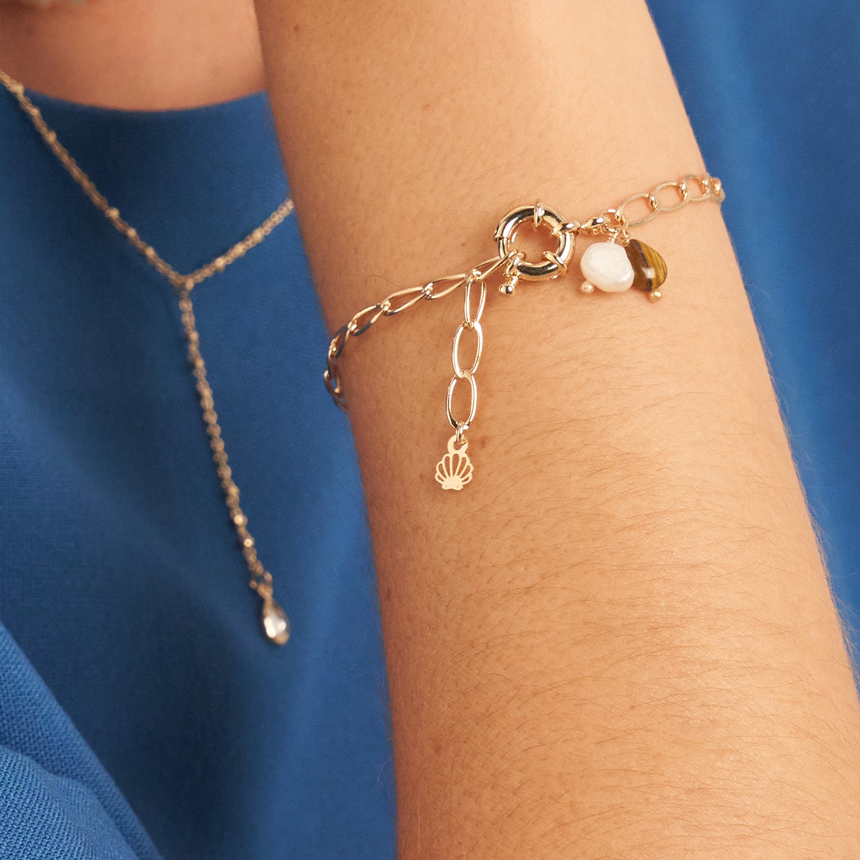 A pulseira Kaylane transmite sofisticação e charme na composição, faz a junção da pulseira groumet e os pingentes de pedra olho de tigre e pérola barroca pão. Possui a nossa concha Una e fecho boia. Peça banhada em ouro 18k, com verniz antialérgico e níquel free.