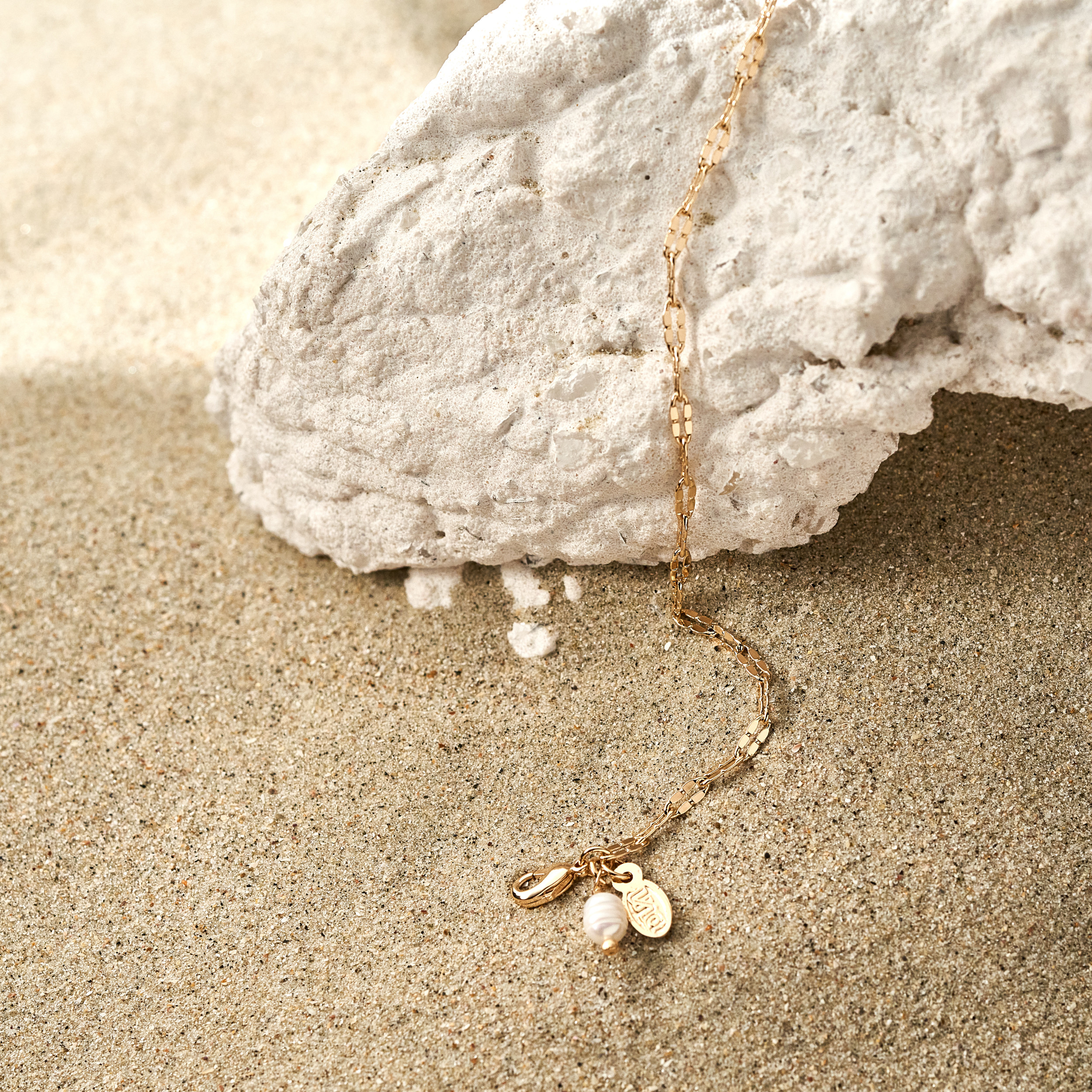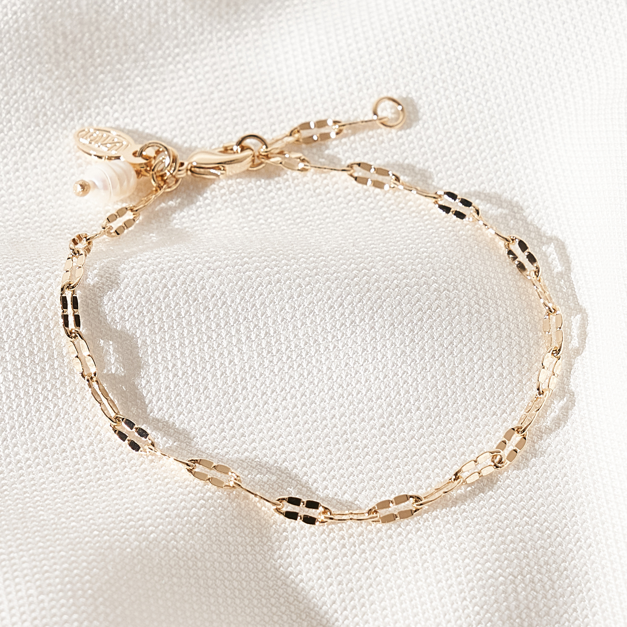 Pulseira Marlisa moderno de corrente trabalhada com textura. Fecho lagosta com detalhe de pérola natural arroz irregular de água doce mini placa oval (Una - Ps 139:14). Extensor em 2 medidas. Banhado em ouro 18k, com verniz antialérgico e níquel free. Pode ter variações no formato e cor da pérola.