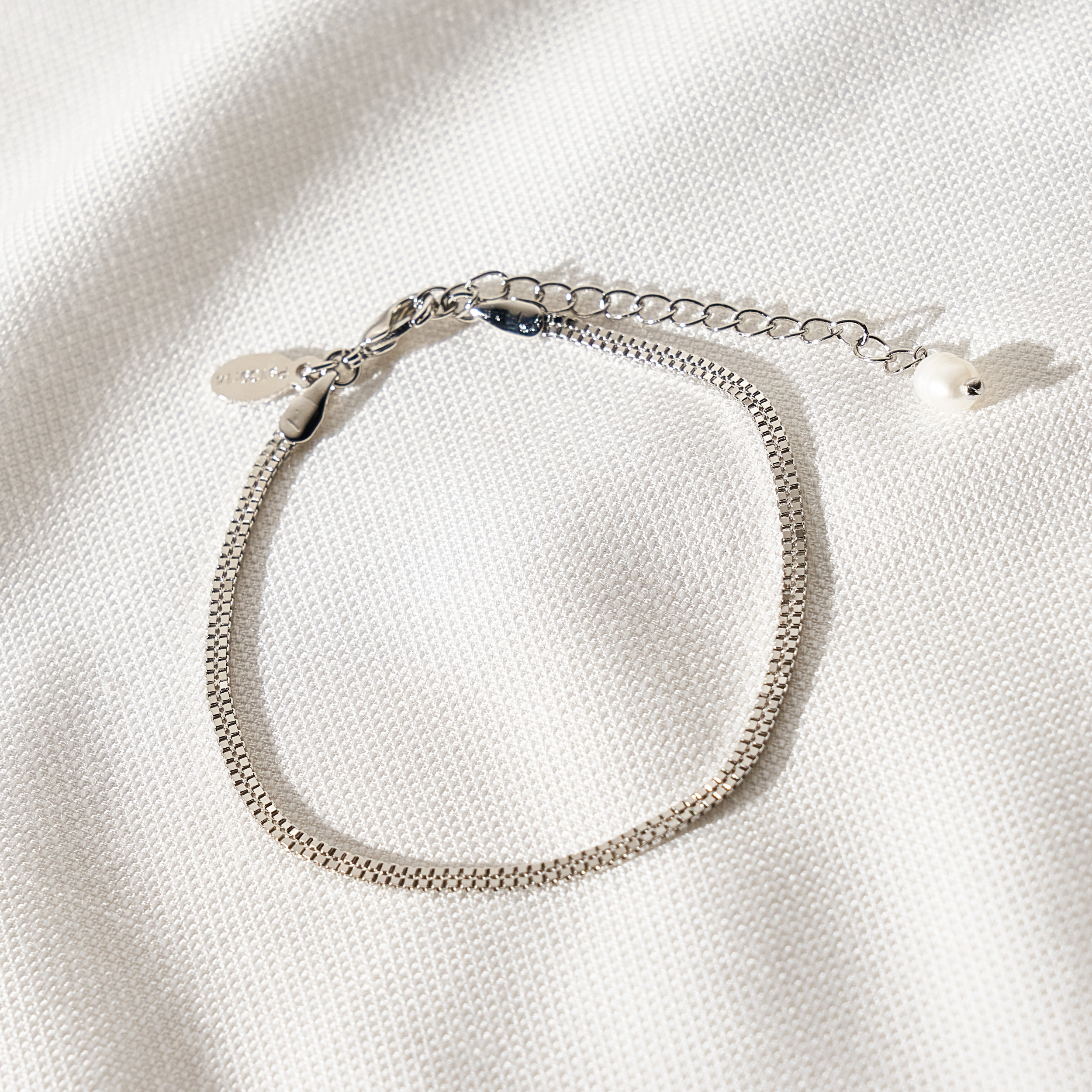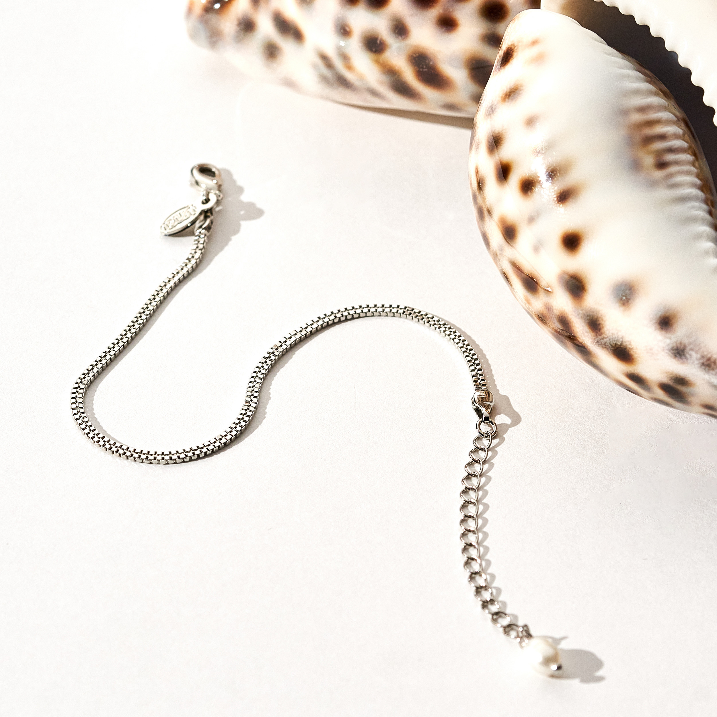 Pulseira Nanda minimal de corrente veneziana dupla. Fecho lagosta com detalhe de mini placa oval (Una - Ps 139:14). Extensor com pérola arroz riscada natural de água doce. Banhado em ródio branco, com verniz antialérgico e níquel free. Pode ter variações no formato e cor da pérola.