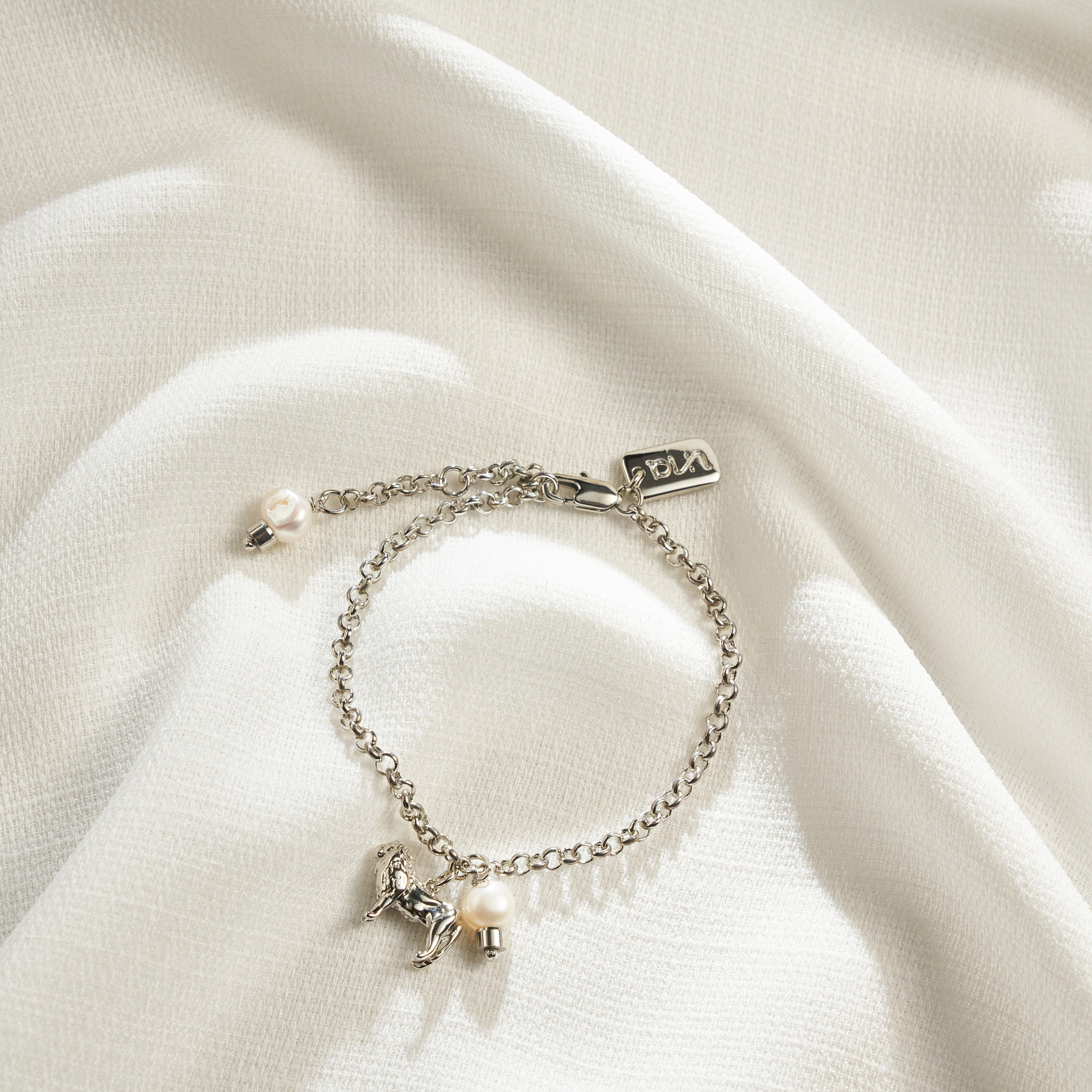 Pulseira Paty amável com corrente de elo português e pingente fixo de leão e mini pérola pão. Extensor em 2 medidas com detalhe de mini pérola pão. Fecho italiano com mini placa retangular (Ps139:14). Banhado em ródio branco, com verniz antialérgico e níquel free. Pode ter variação no formato e cor da pérola.