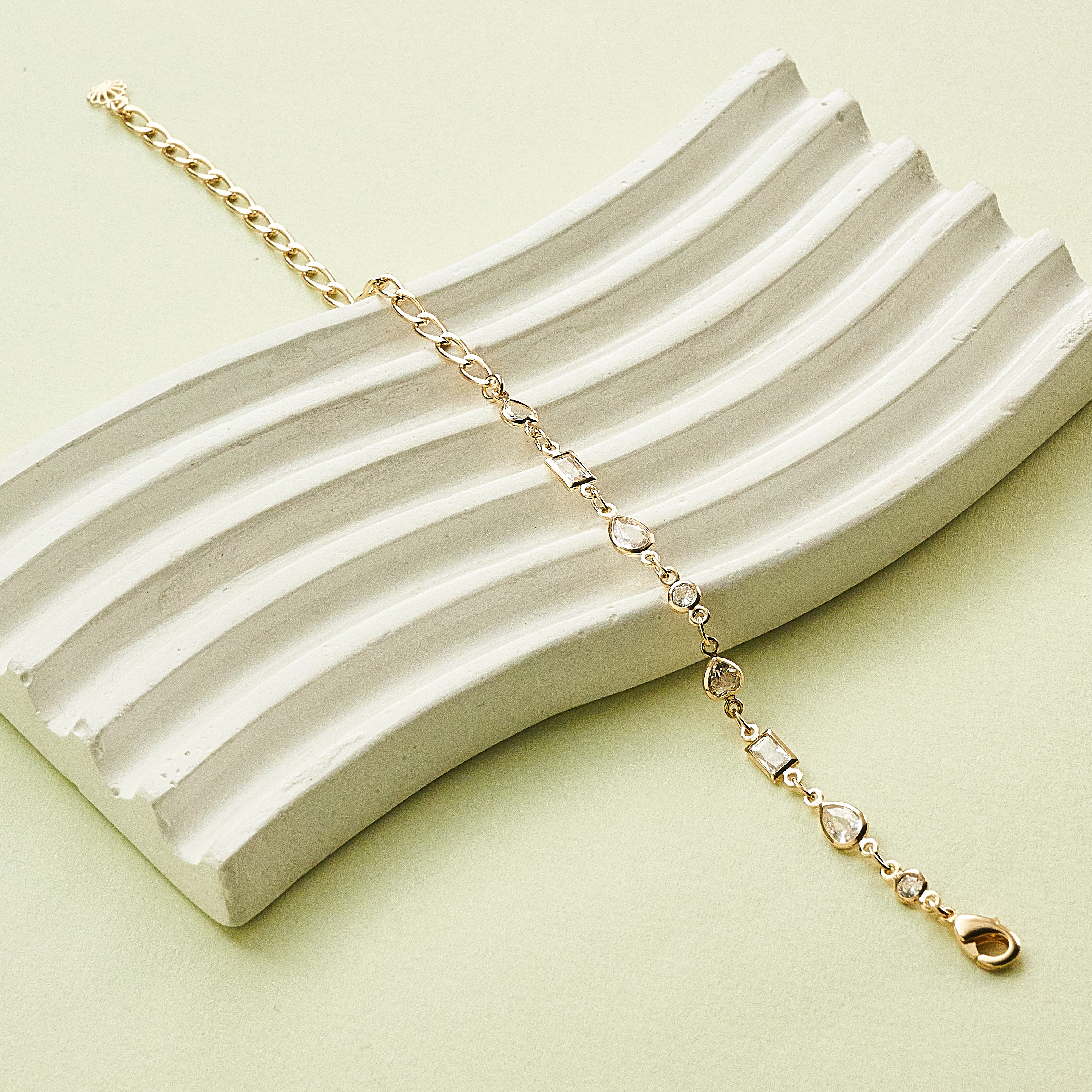 Delicada e atemporal, a pulseira Polly é perfeita para ser usada individualmente ou na composição de um mix. Possui corrente gourmet e pingentes de zircônias em formatos geométricos que fazem todo o charme da peça. Possui fecho lagosta com detalhe da nossa concha Una. Banhado em ouro 18k, com verniz antialérgico e níquel free.