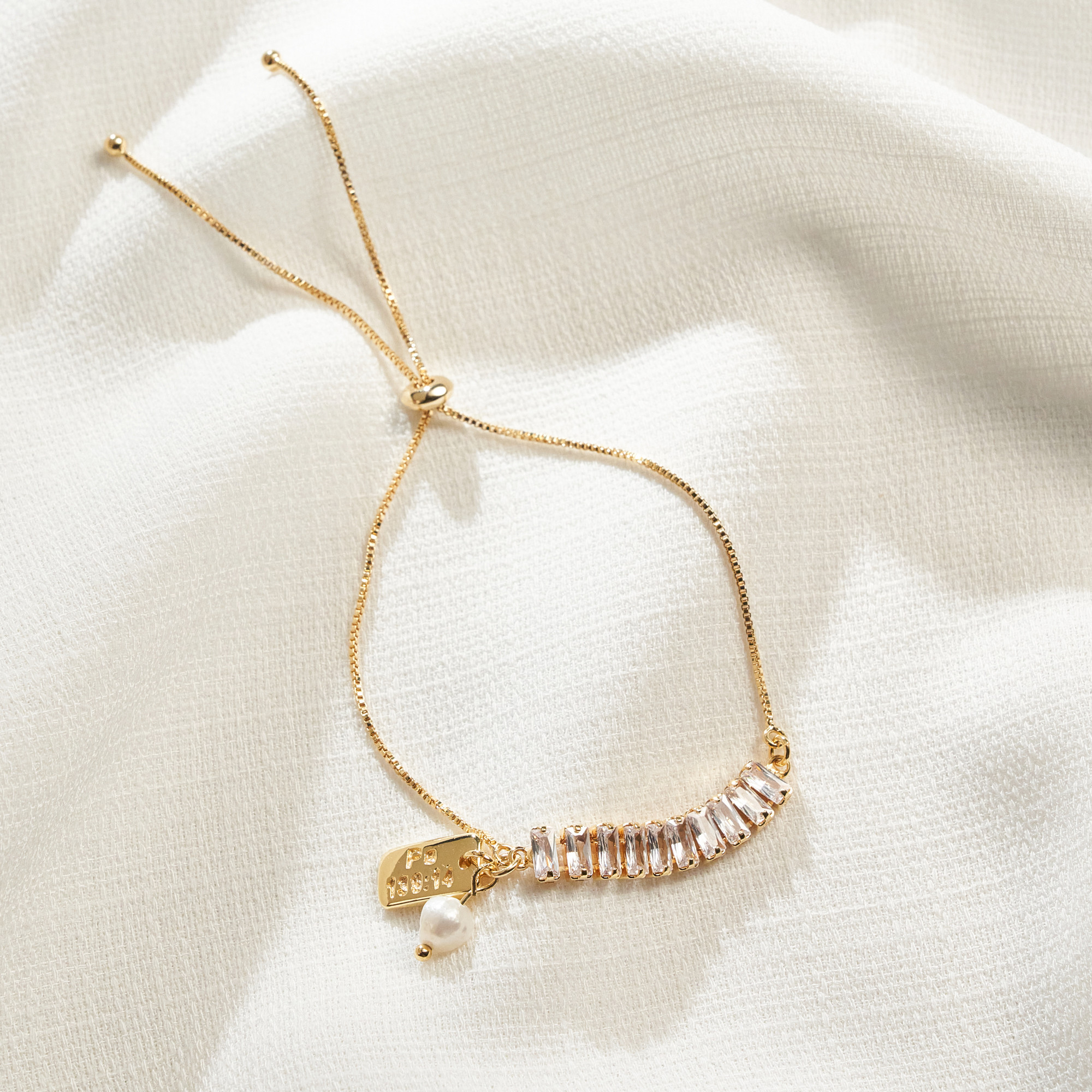 Pulseira Sophia brilhante com corrente veneziana, arranjo central cravejado de zircônias e detalhe de pérola barroca pão no balanço. Fecho regulável gravata. Mini placa retangular (Ps 139:14). Banhada em ouro 18k, com verniz antialérgico e níquel free. Pode ter variação no formato e cor das pérolas.