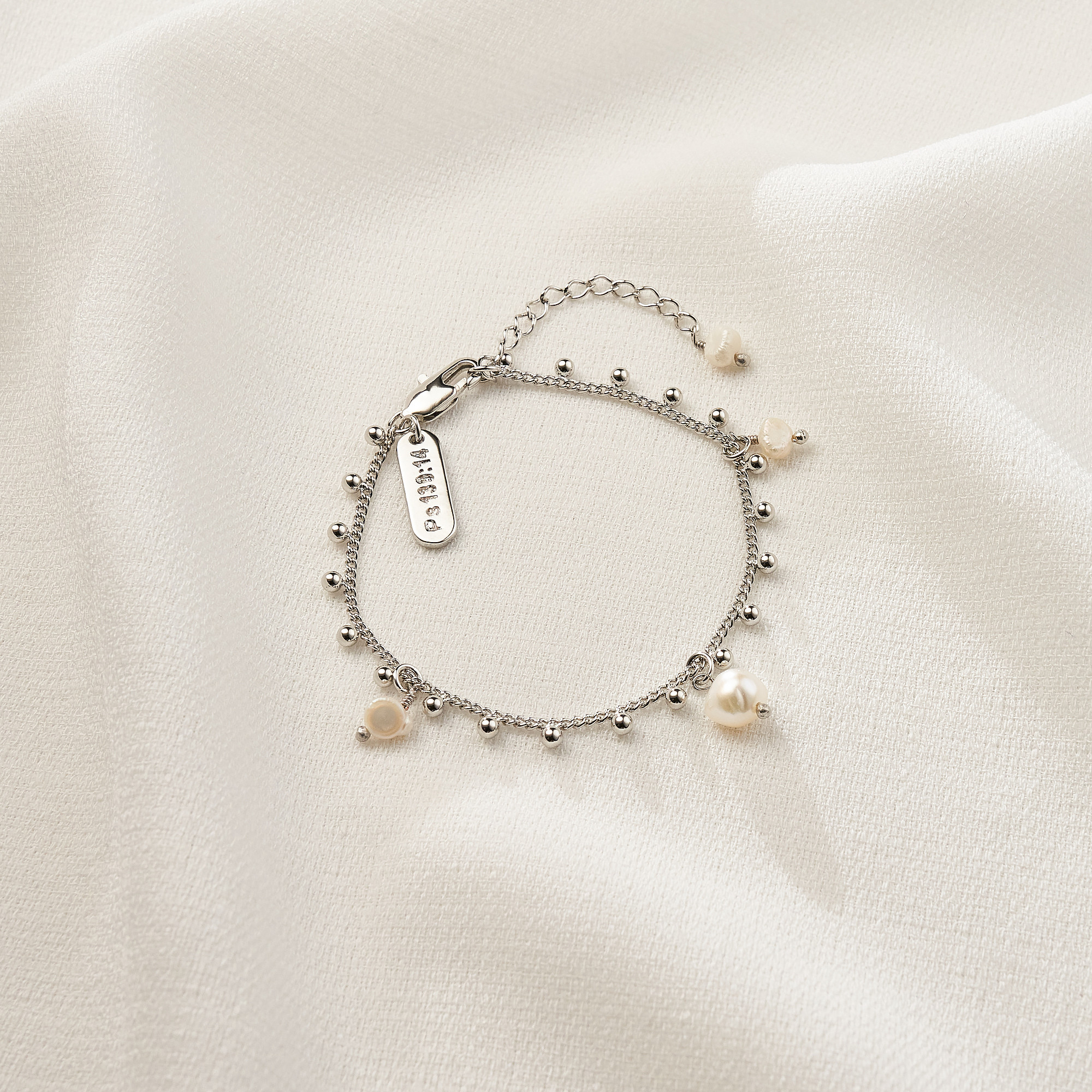 Pulseira Tayna charmosa de corrente trabalhada com mini esferas fixas em todo seu entorno intercaldas por 3 pérolas barrocas irregulares. Fecho italiano com mini placa oval (Ps 139:14). Extensor com pérola barroca pão irregular. Banhado em ródio branco, com verniz antialérgico e níquel free. Pode ter variações no formato e cor das pérolas.